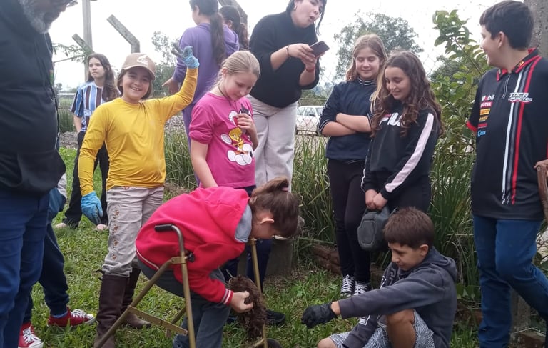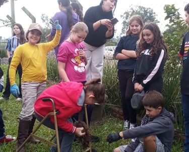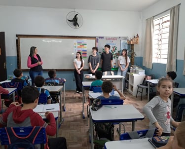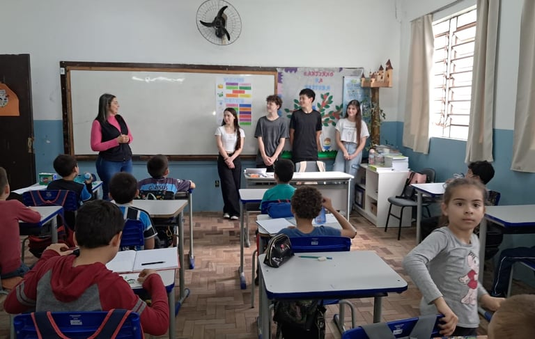 Professora Carla Atarão com os alunos do 9° ano da EMEF Coqueiros apresentando na tarde do dia 02.10.2025 o seu projeto "Conociendo la lengua española” na turma do 2° ano da EMEF Coqueiros sob a regência da Professora Priscila.